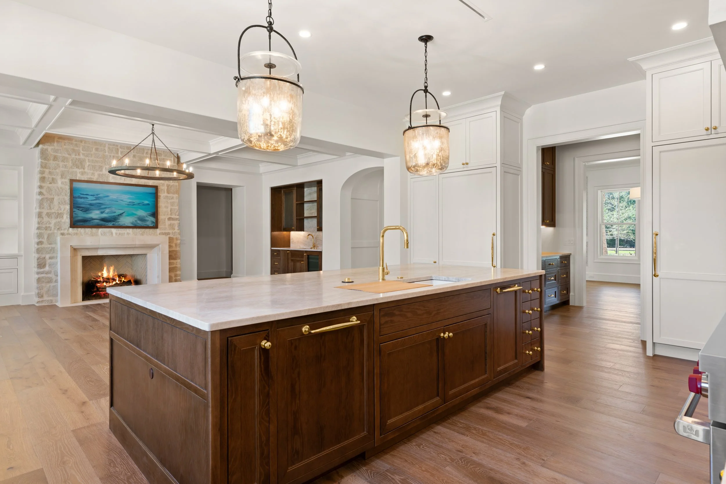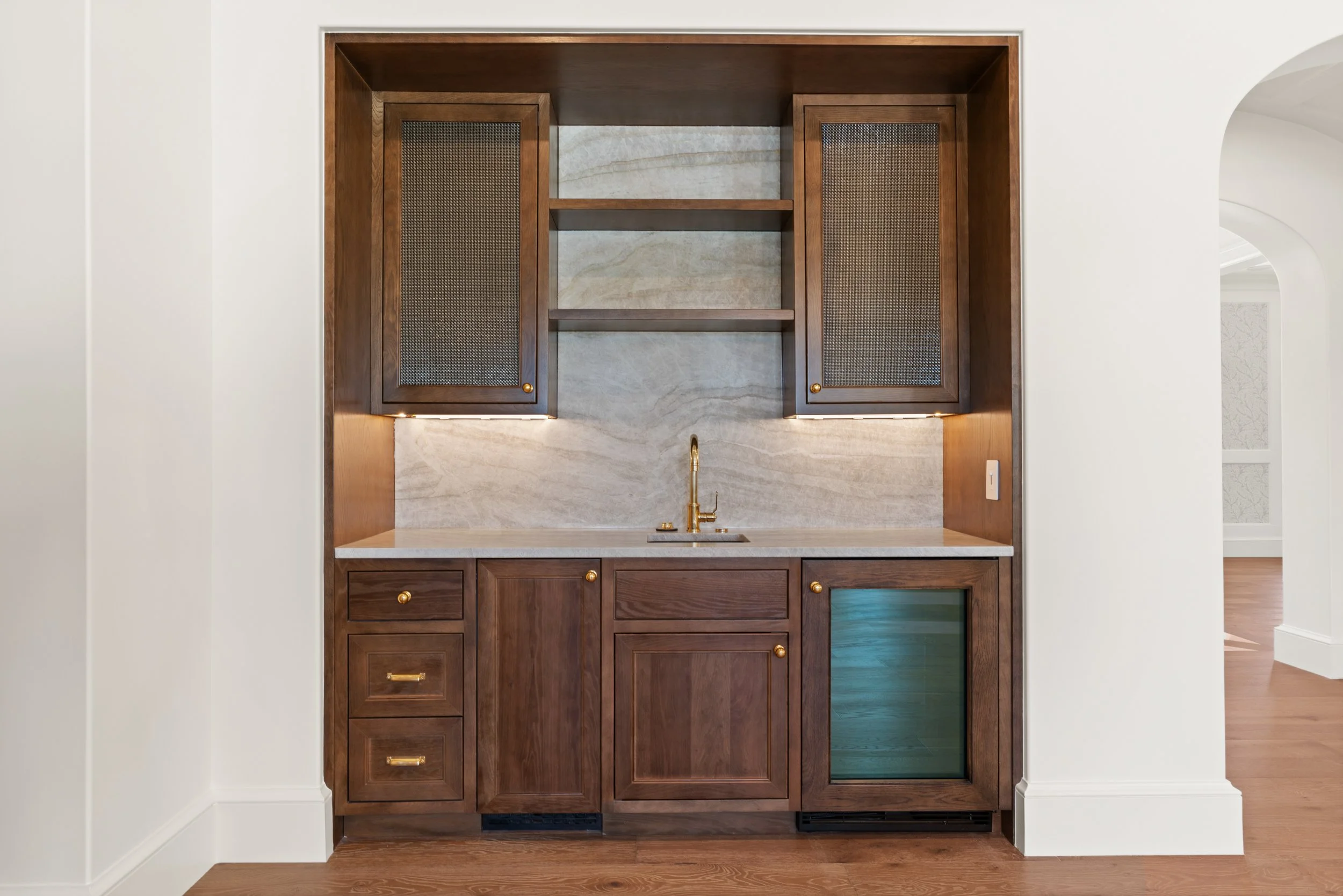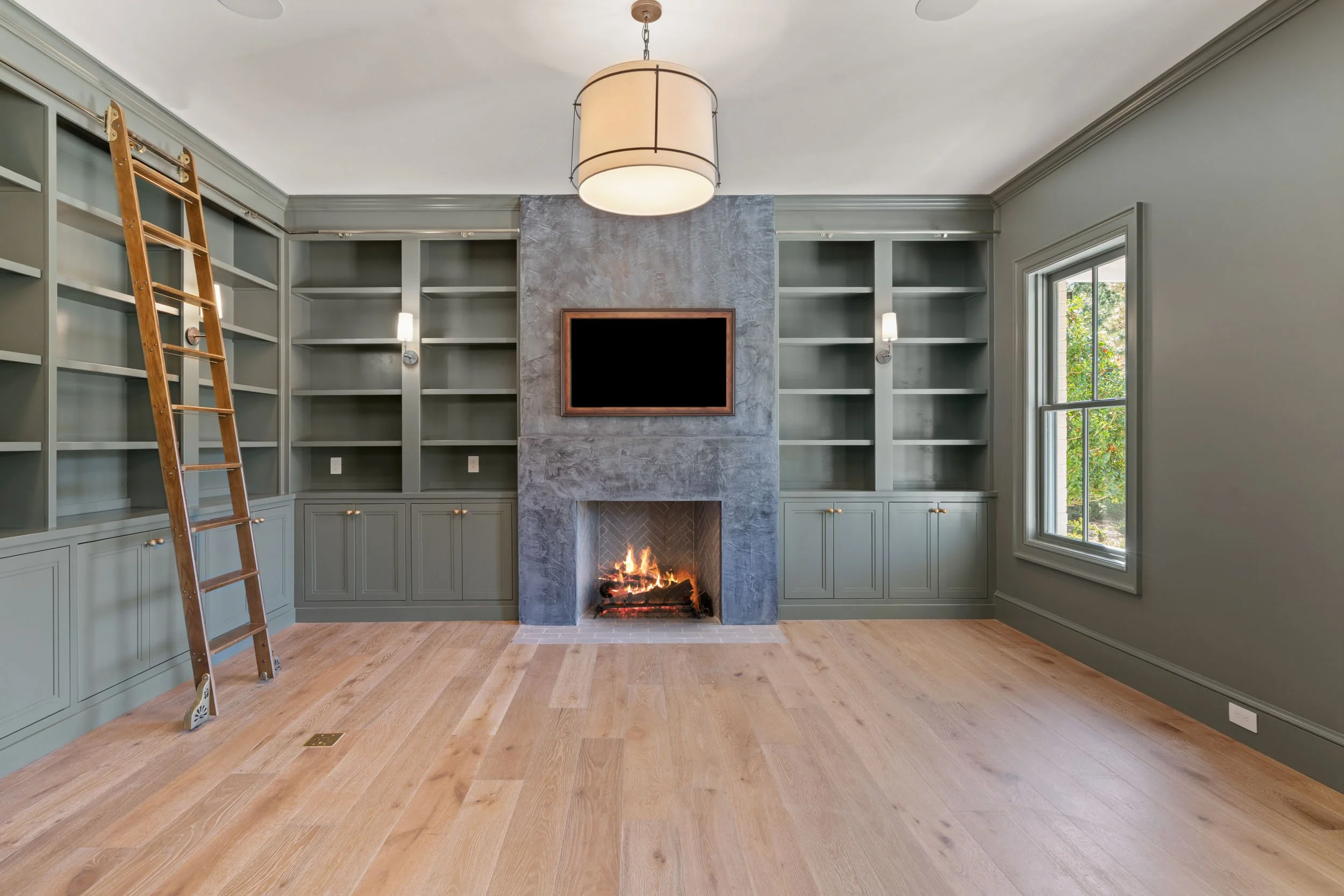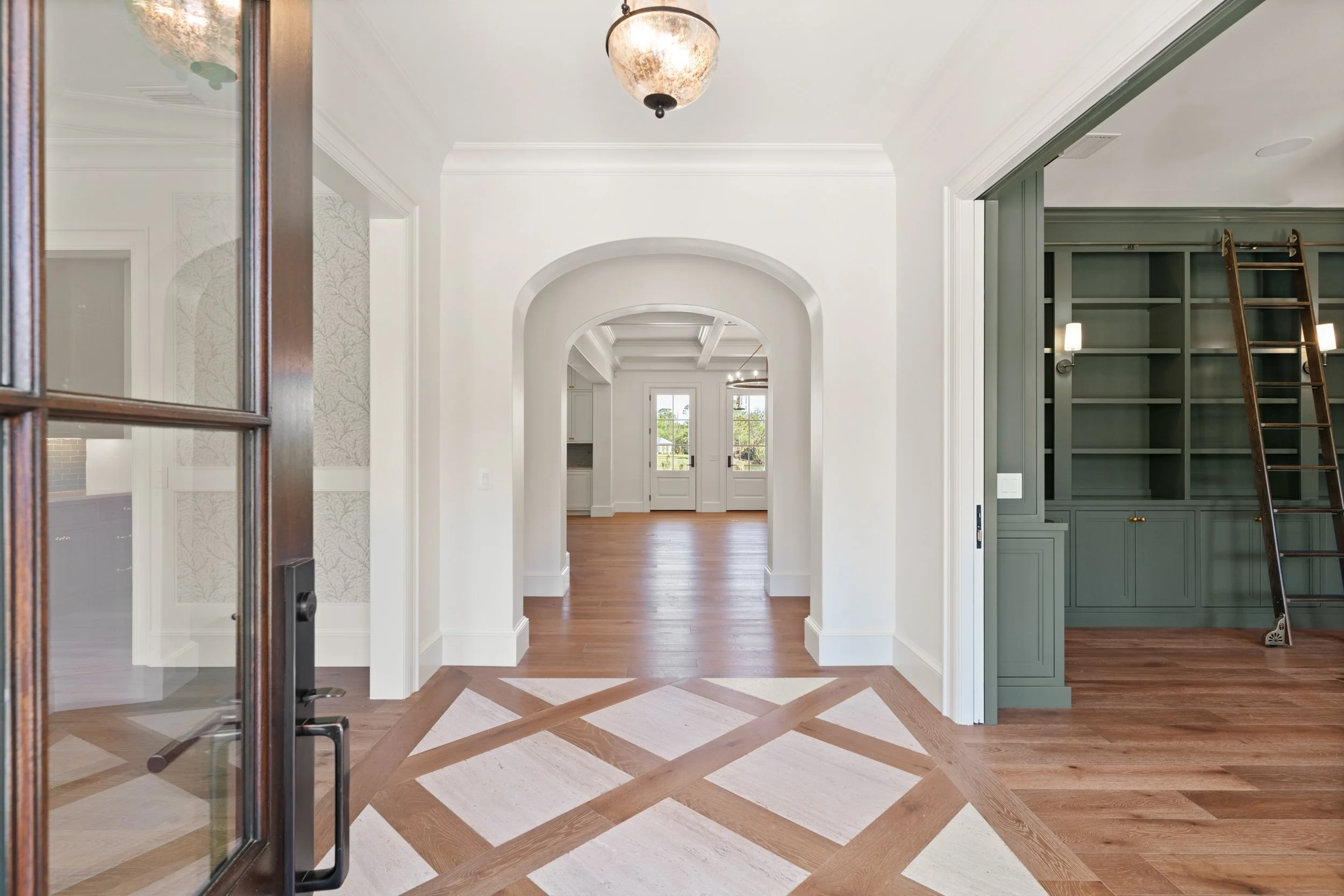 The design utilizes a highly deliberate approach, beginning with a circular arrival court that guides the visitor through a rhythmic sequence, creating a sense of decompression upon entry. Inside, the home prioritizes a clean, minimalist palette where light, volume, and curated materials define the user experience. Bespoke, full height millwork, often executed in a moody, sophisticated palette, provides a grounding contrast to the light and airy circulation paths that define the home’s interior character.